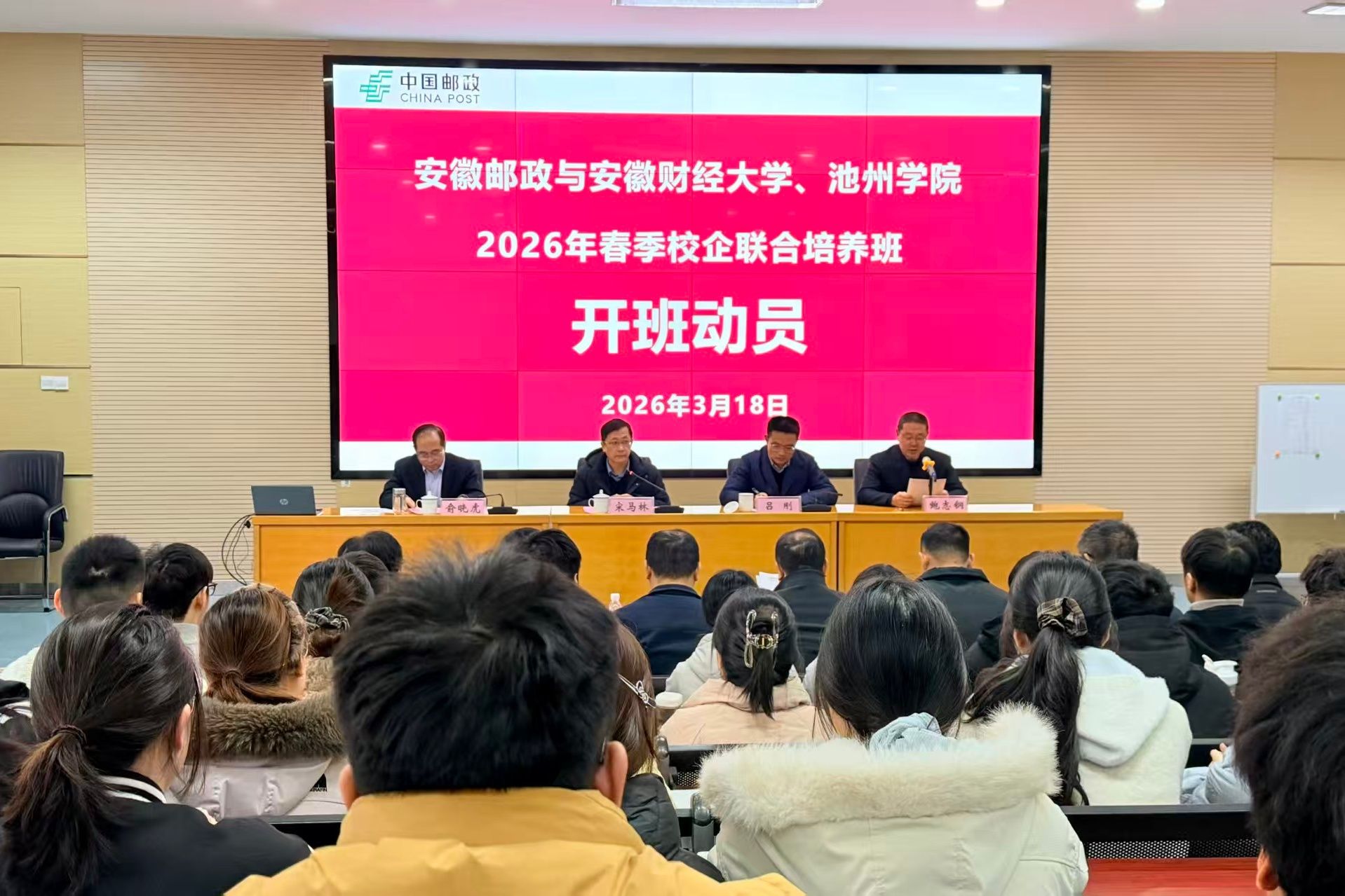 3月18日,我校与中国邮政集团有限公司安徽省分公司、安徽财经大学携手举办的2026年春季“金融服务与管理(邮政方向)”微专业联合培养班开班仪式,在安徽邮政省人才发展中心隆重举行。中国邮政集团有限公司安徽省分公司党委组织部部长、人力资源部总经理俞晓虎,安徽财经大学党委常委、副校长宋马林,我校党委委员、副校长吕刚出席仪式。仪式由安徽邮政人才发展中心主任鲍志钢主持。