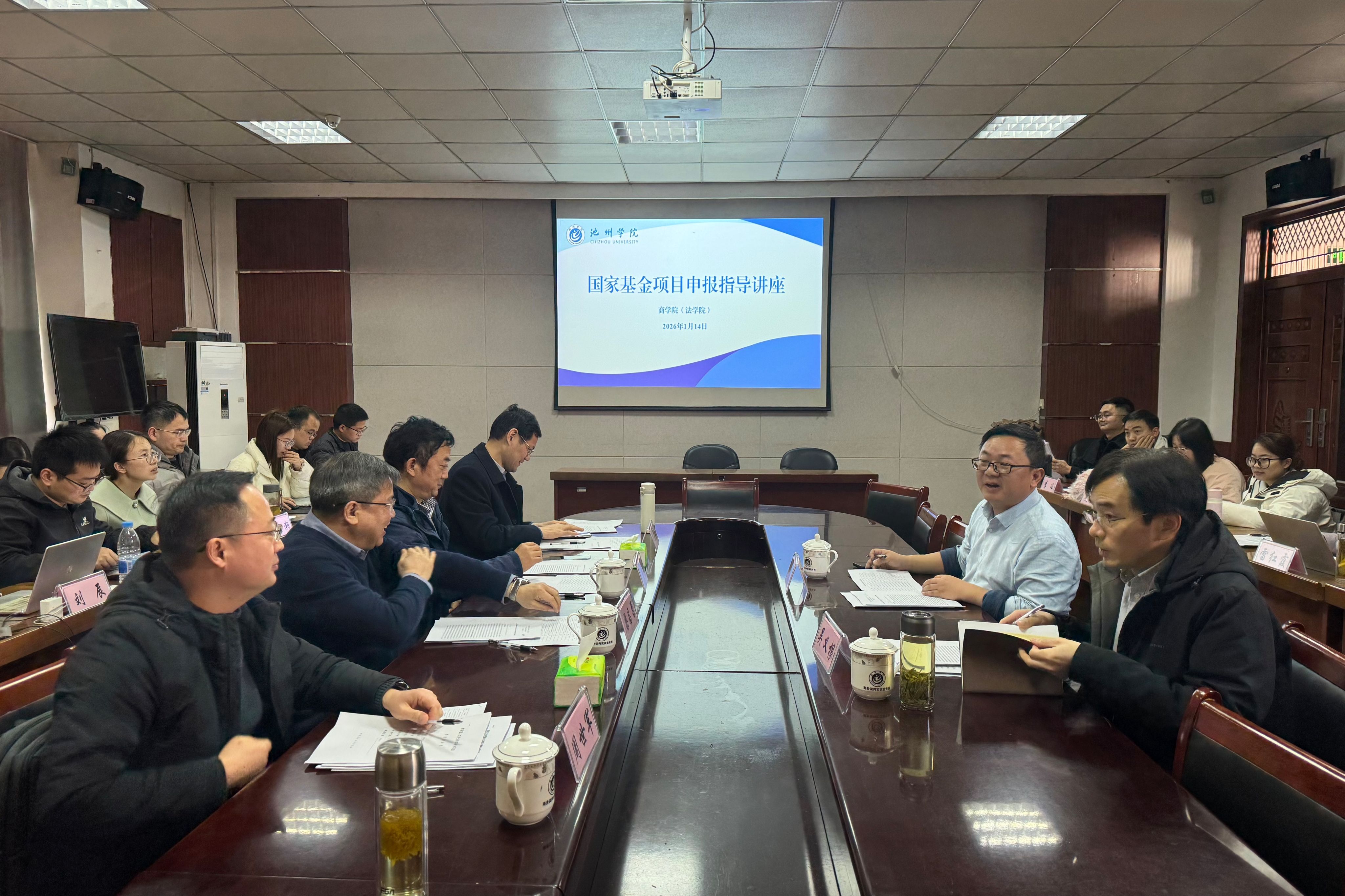 2026年1月14日下午,池州学院商学院(法学院)举办国家基金项目申报指导讲座,教育部长江学者特聘教授、合肥工业大学科研院副院长梁昌勇教授、南京航空航天大学周德群教授、安徽工业大学商学院院长章铁生教授、安徽工业大学商学院副院长周世军教授应邀出席,学院领导班子成员、全体副高及以上职称教师、博士教师参加会议,会议由学院院长吴自爱主持。